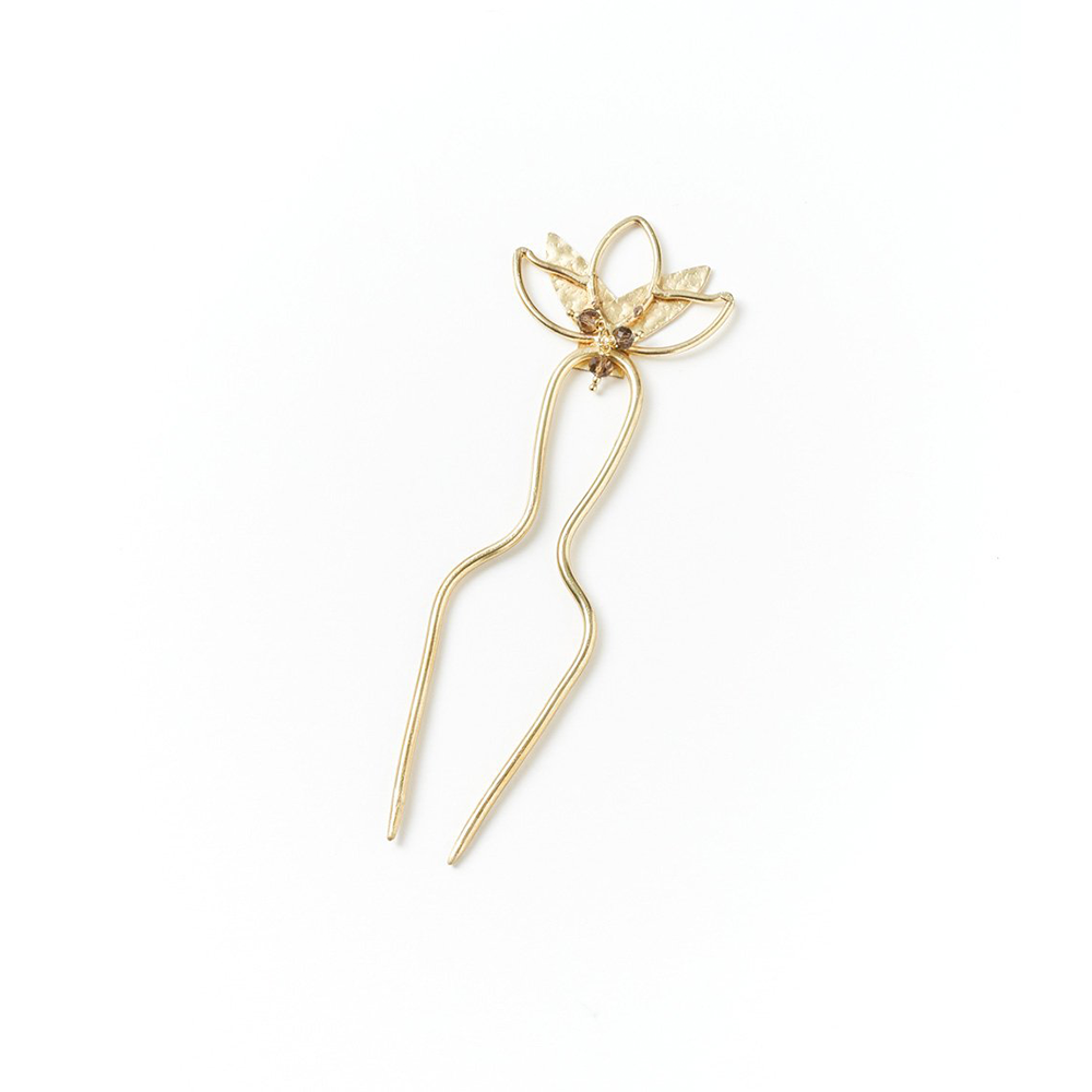 Our Kairavini Collection features unique, lotus-inspired designs in gold and silver finish. This unique, hand hammered hair pin features a multi-layered lotus design with subtle, black bicone bead detail.