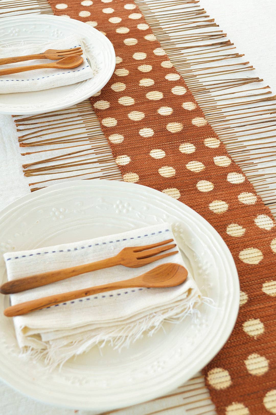 Malian artisans weave dried twigs and cotton cord into a uniquely African decorative table runner. A bold strip of pattern and natural textures enliven the tabletop.