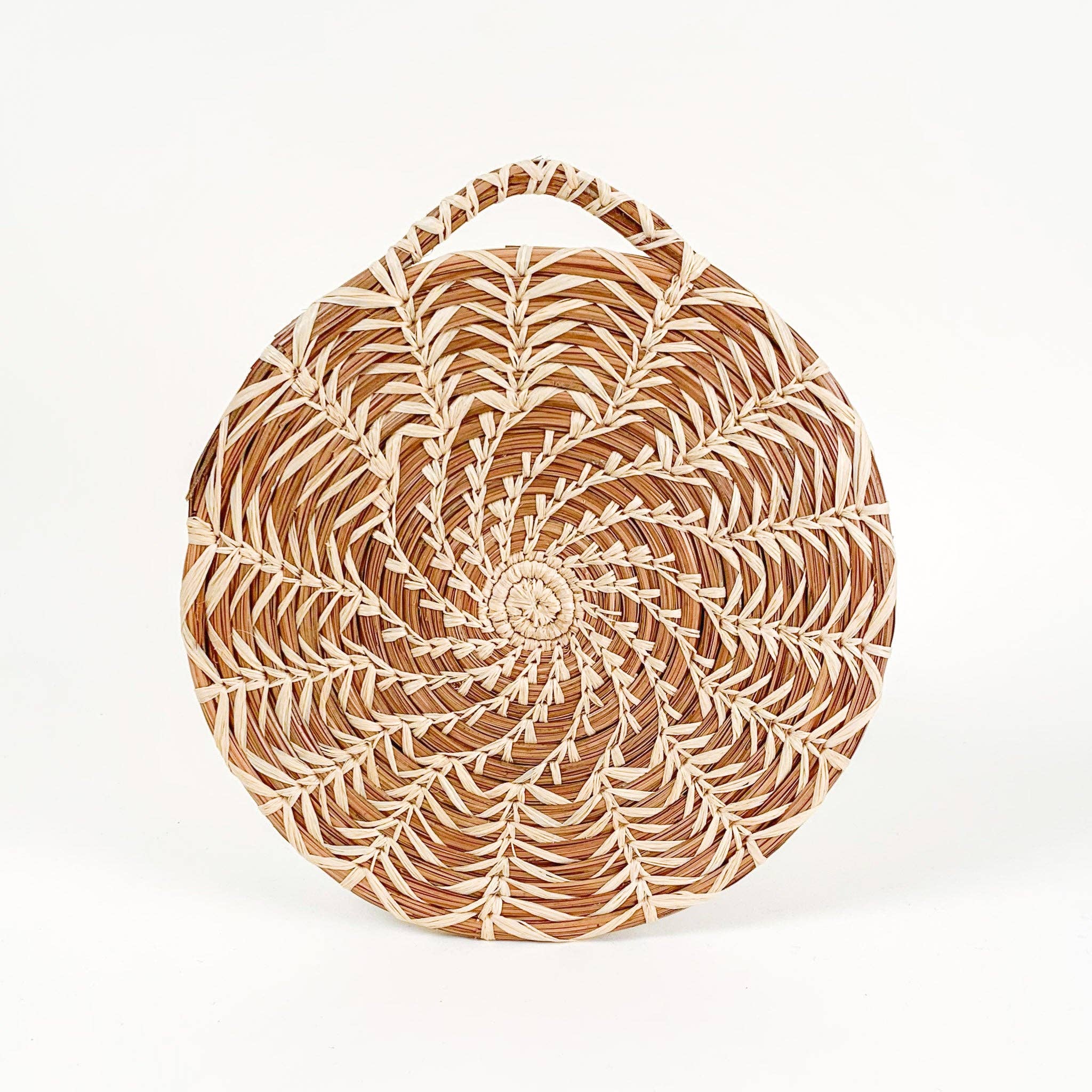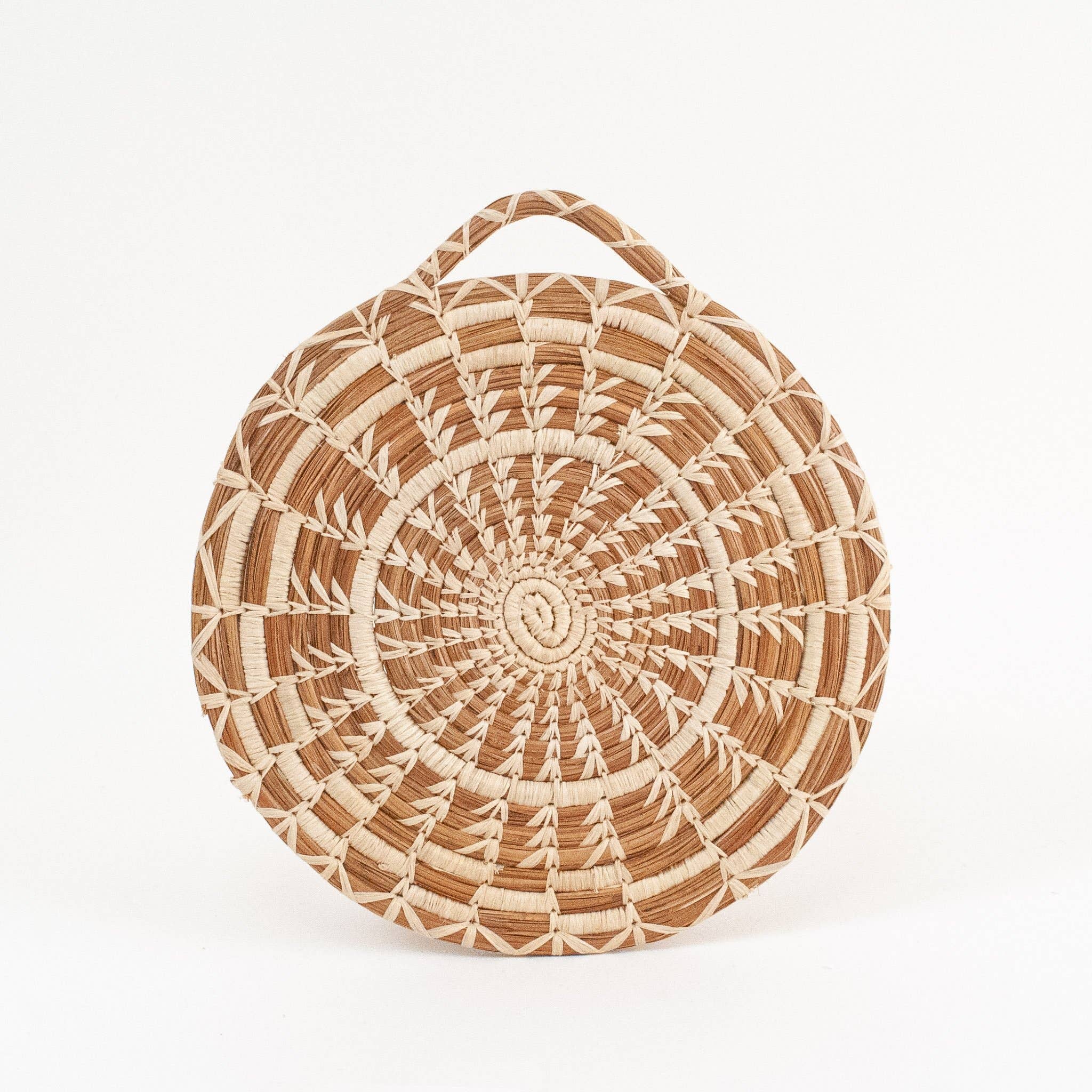 Intricately stitched by basket makers in Sololá from longleaf pine needles, this heat resistant trivet is perfect to set on your table to protect it from hot dishes, and lovely displayed on the wall when not being used.