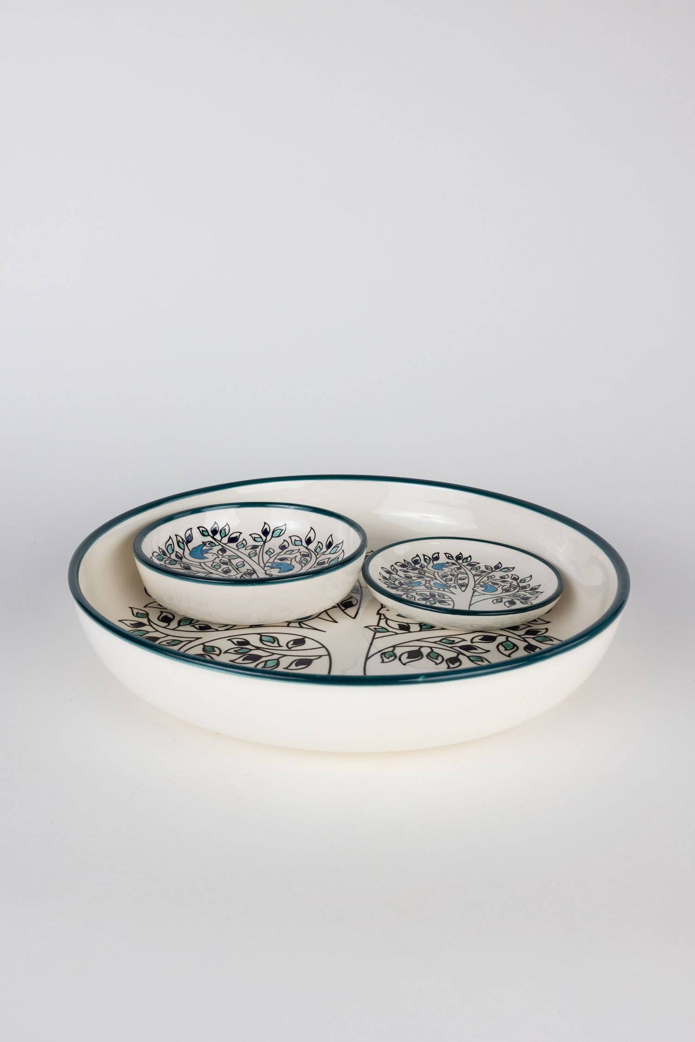 Material: ceramic - Product Care: handwash - 6"Dx1.5"H - Pictured with our smaller Olive Tree Gathering Dish, SKU 2706750, & larger Olive Tree Gathering Serving Bowl, SKU 2706770. - Handcrafted in West Bank