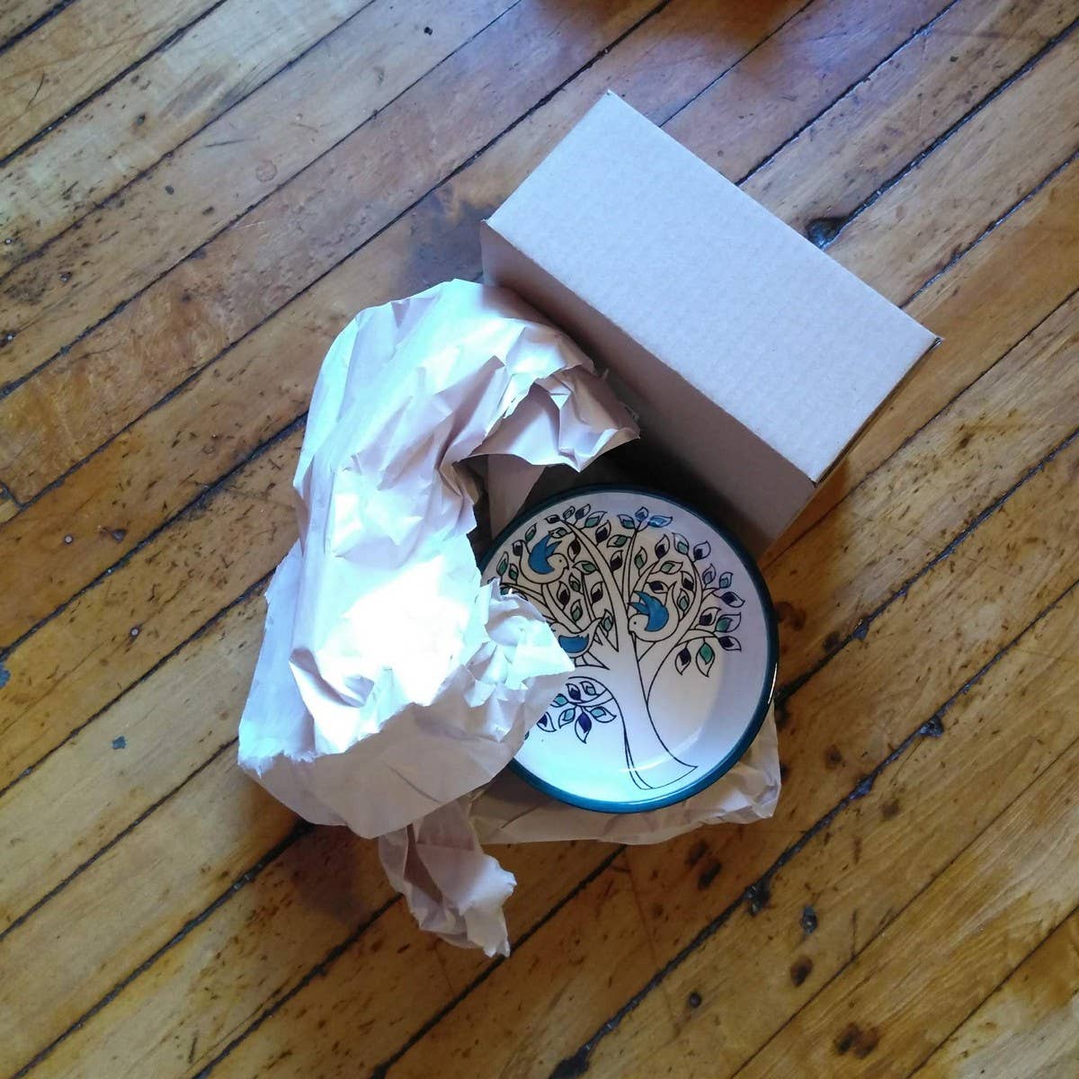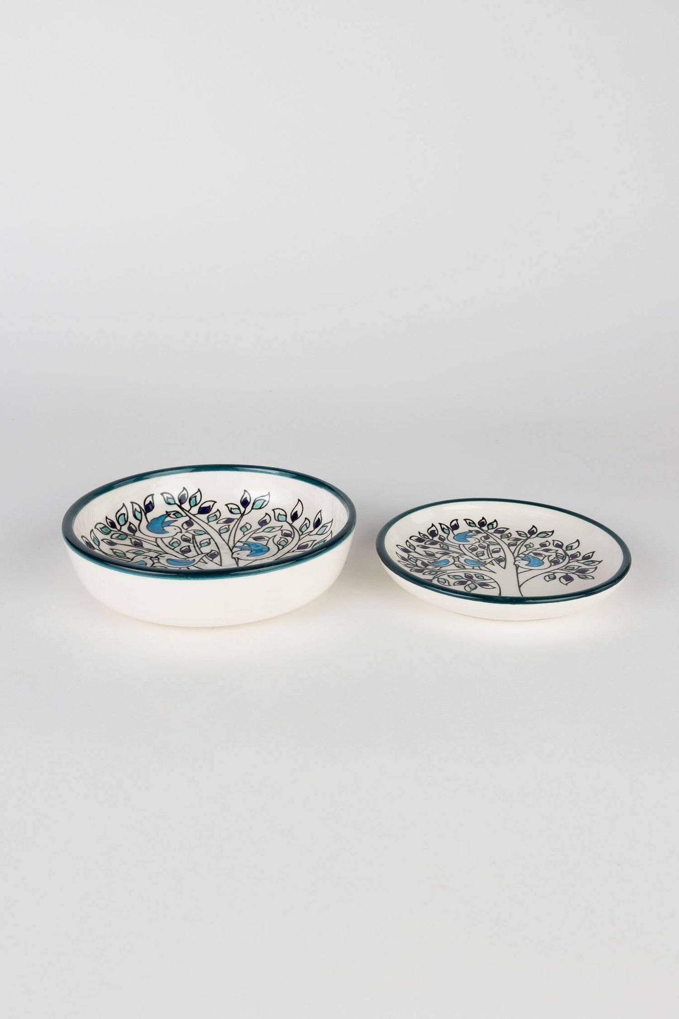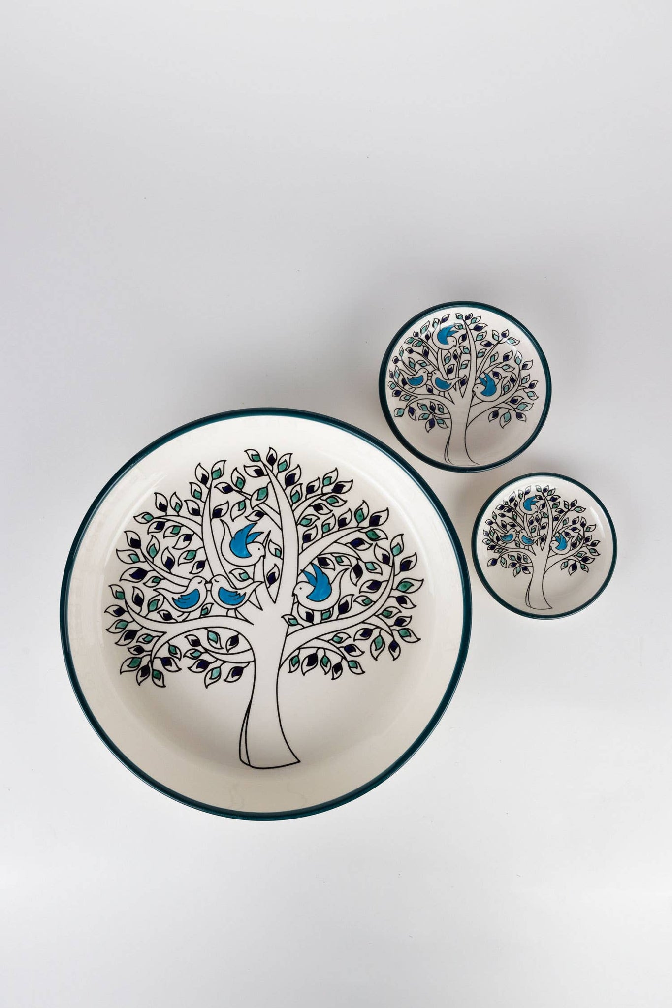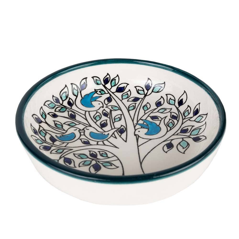 Handcrafted by ceramic artisans in West Bank, the handpainted birds gather together in harmony in the olive tree in this design. The olive tree is painted in shades of green and navy blue while the birds have cerulean blue wings. Grab a set or two and your dinner party will be reaching high marks in design and sustainability.