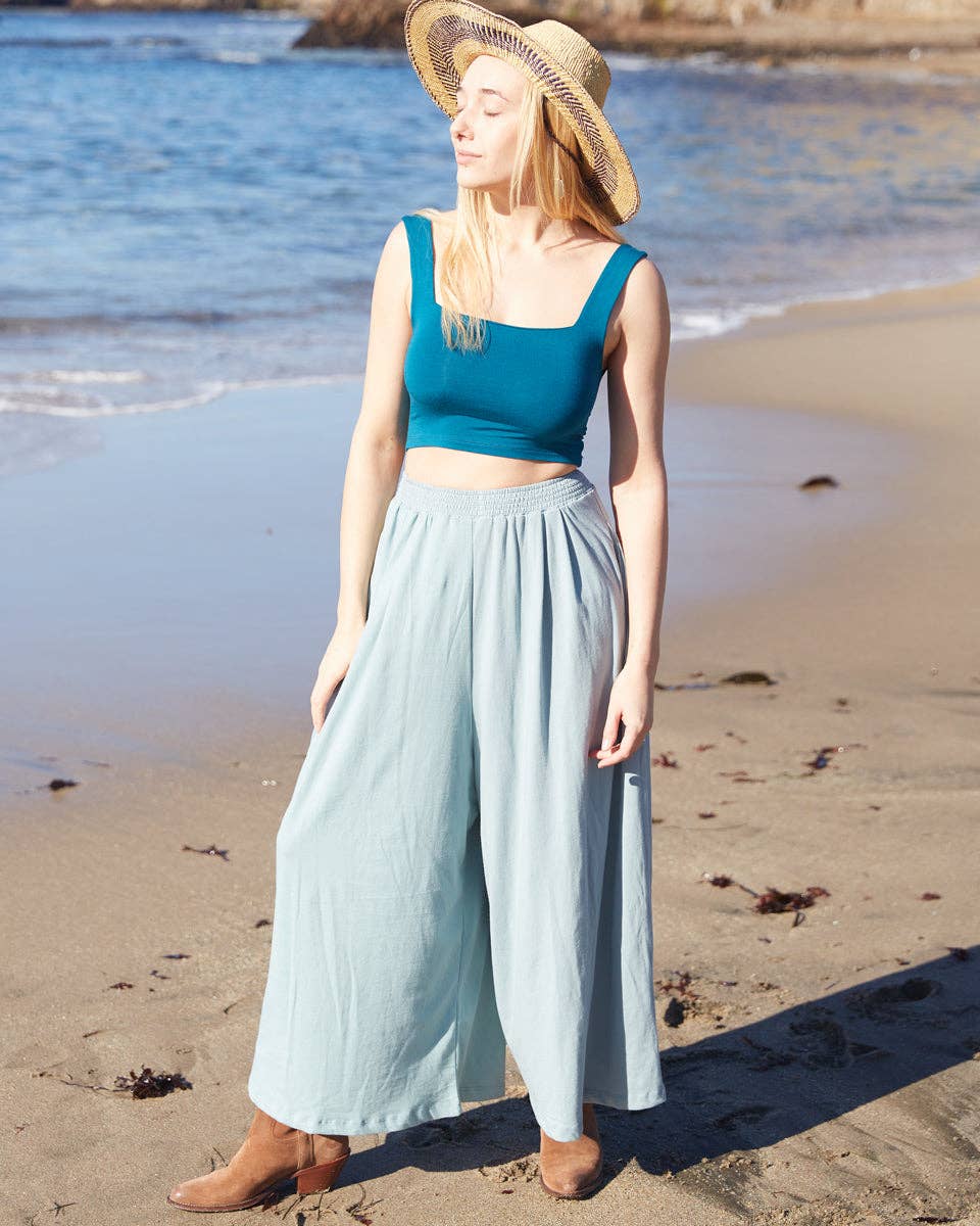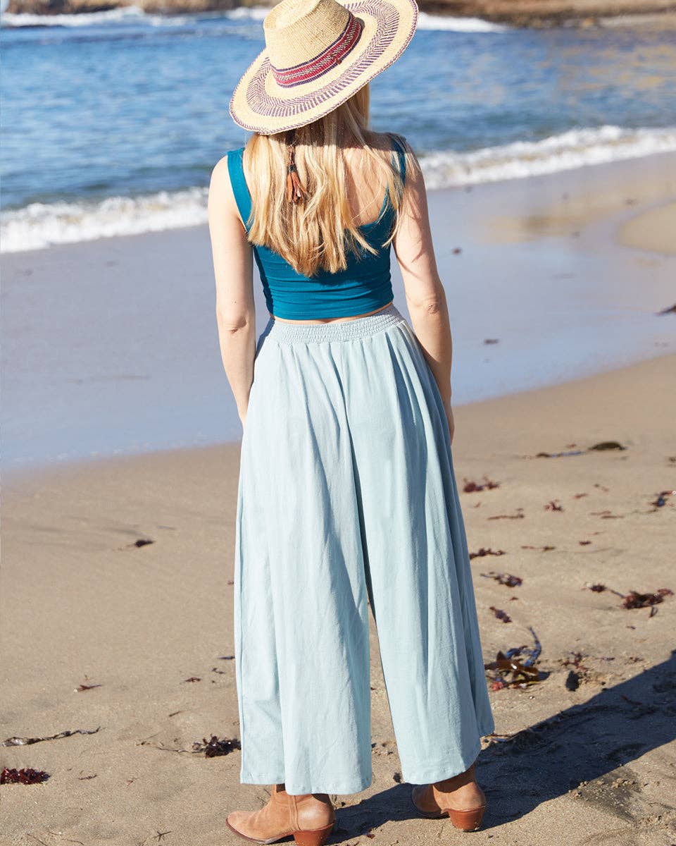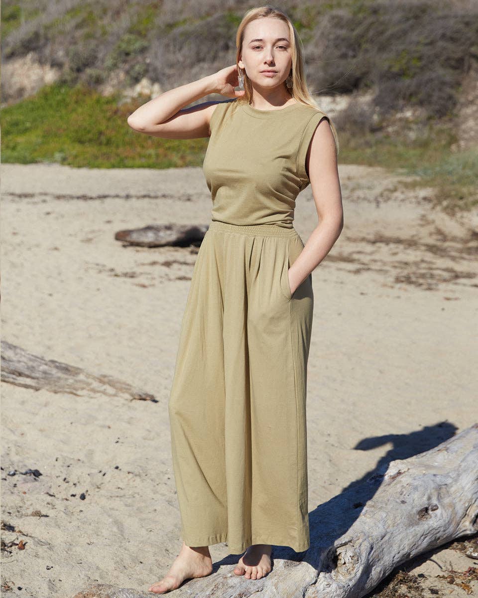 These simple wide leg pants are made with a soft organic cotton and have an elastic waist. Can be paired with Organic Button Down Top and Organic Tank Top * 100% organic cotton * one size, fits up to size 12 *