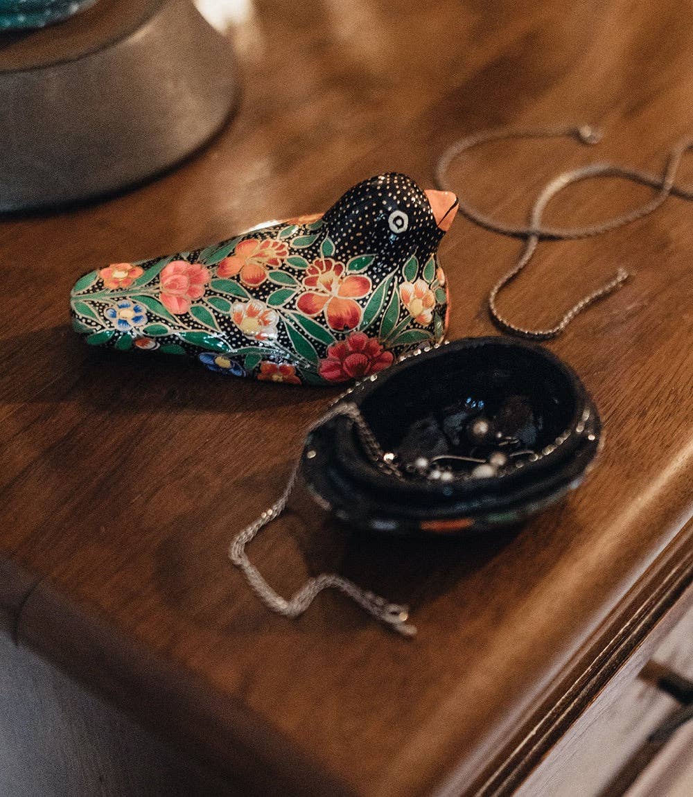 Parakeet bird box in vibrant hand-painted floral designs with gold accents. Cover lifts to reveal egg-shaped storage space. Gift this intricately hand painted box to a bird lover or use it as an eco-friendly gift box to hide a surprise gift inside! *Colors cannot be chosen, priced per individual piece.