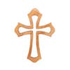 Beautiful carved wood crosses; a perfect accent piece. Lovely gifts for baptism, first communion or confirmation.The reverse side has a small indentation to allow for hanging on a wall. 4 1/4" x 5 1/8". Natural wood hanging hole on reverse side.
