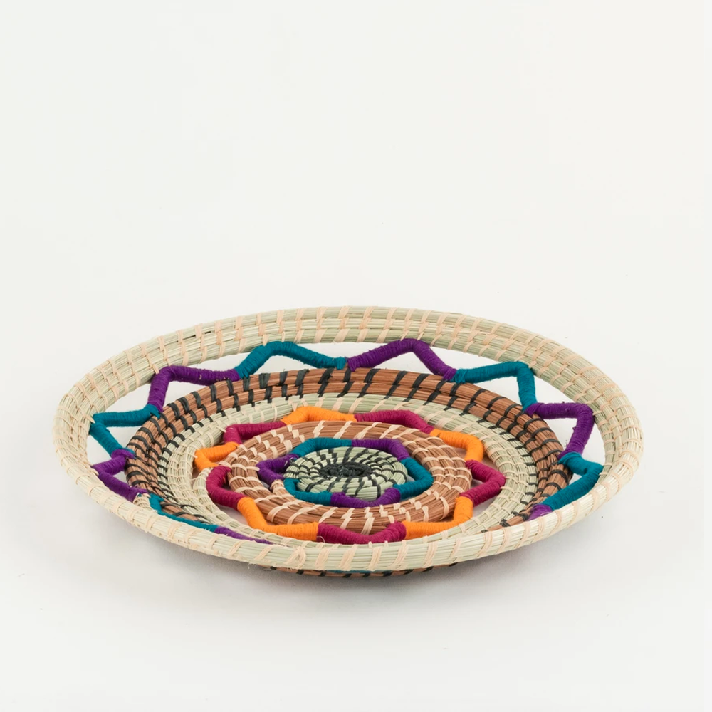 Undulating rows of colorful cotton thread are wrapped and woven with pajón, a native grass to Guatemala and longleaf pine needles to create the Juana Basket. Our artisan partners love color and designed this shallow basket to coordinate with the colorful table linens woven by Mayan Hands weavers in a nearby community. Available in two colorways, Multi-Color or Purples, to coordinate with our placemats and table runners.