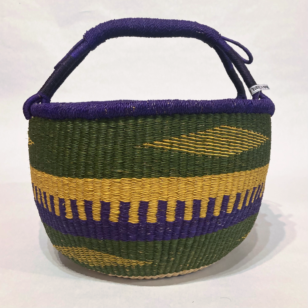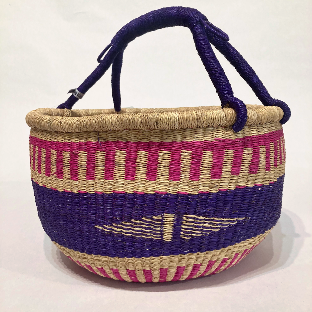 A nice deep basket with a single woven handle in the center. Great for all kinds of storage. Each baskets has unique colors and patterns.