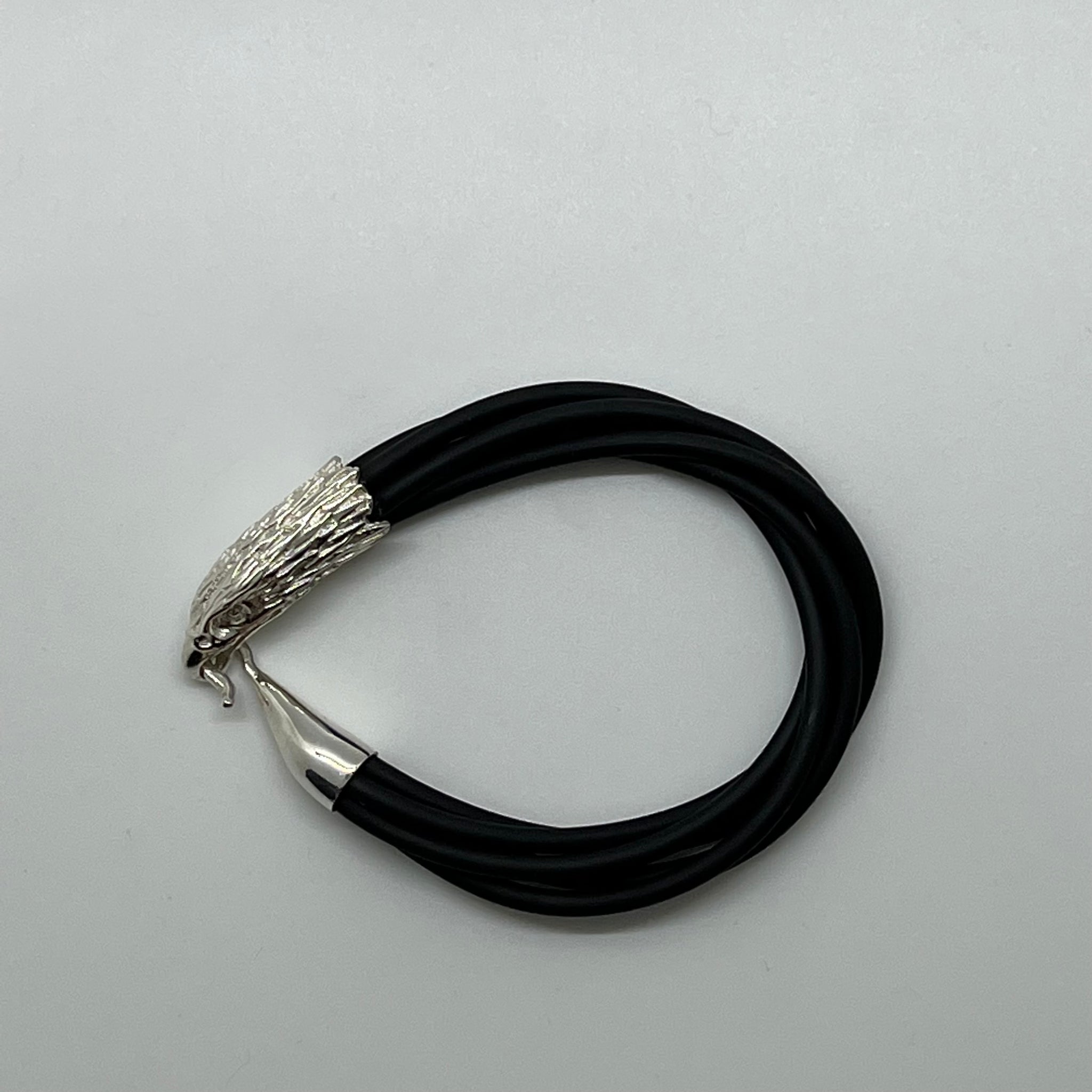 Beautiful eagle head bracelet made with elegant twists of rubber to comfortably incircle your wrist and clasped with a hand carved sterling silver eagle head and clasping mechnism.