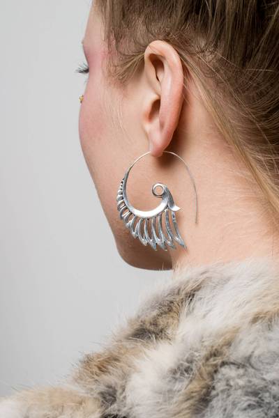 Each wing is a little sculpture, carefully carved and detailed, with the same detail on both sides of each earring. Standard gauge sterling-silver ear-wire is expertly soldered to each wing and shaped to compliment the curve of the wing. Each earring weighs approximately 5 grams. Substantial, yet light enough to wear all day long.