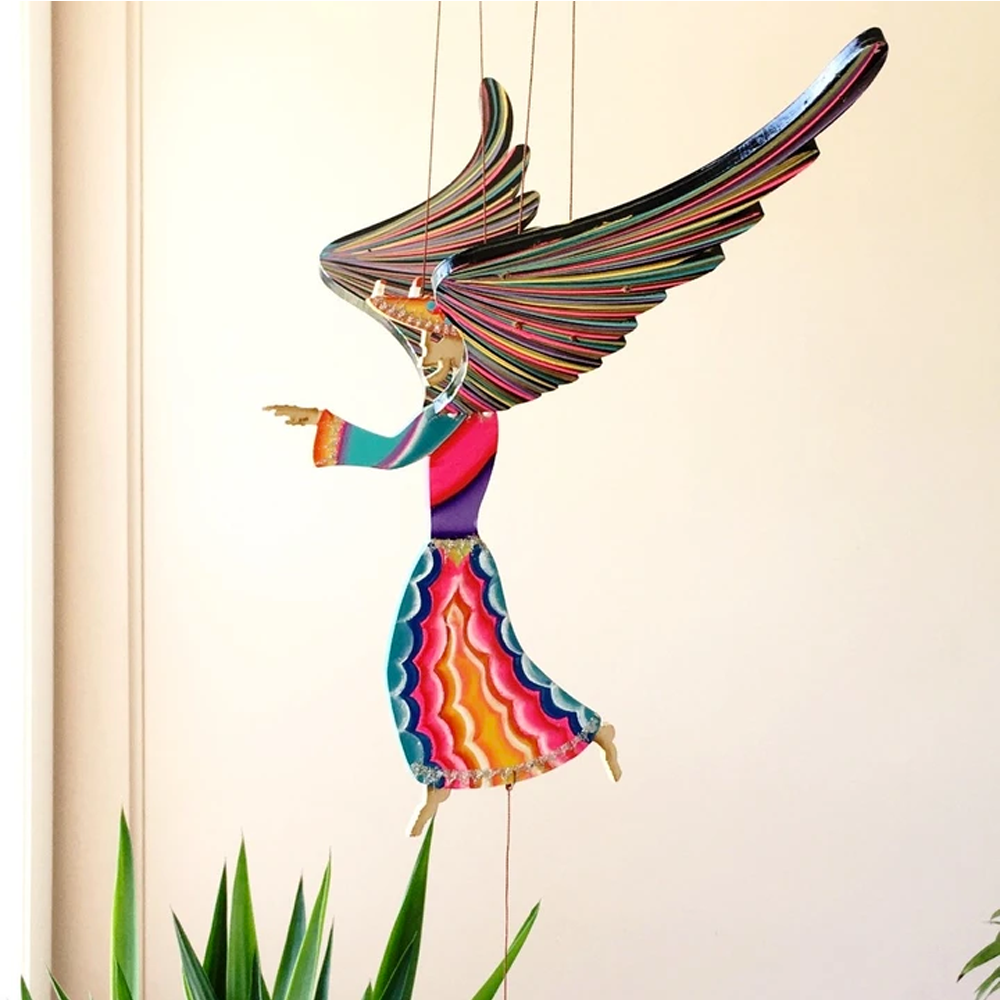 These mobiles are perfectly balanced for the most graceful movement. Just pull and release the bottom string and watch them fly. Each is constructed of medium-density fiberboard, hand-painted, and decorated with dyed tagua nuts. These whimsical flyers are handcrafted by a woman-owned business that employs single moms and internally displaced Afro-Colombians.