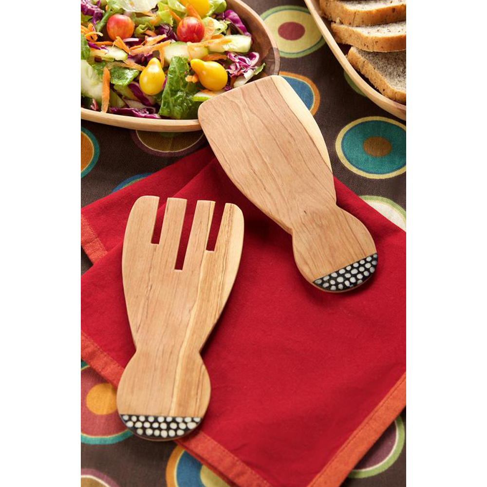 Sold as a set of salad servers with cow bone inlay. Hand wash in warm water, dry promptly and rub with oil before storage.