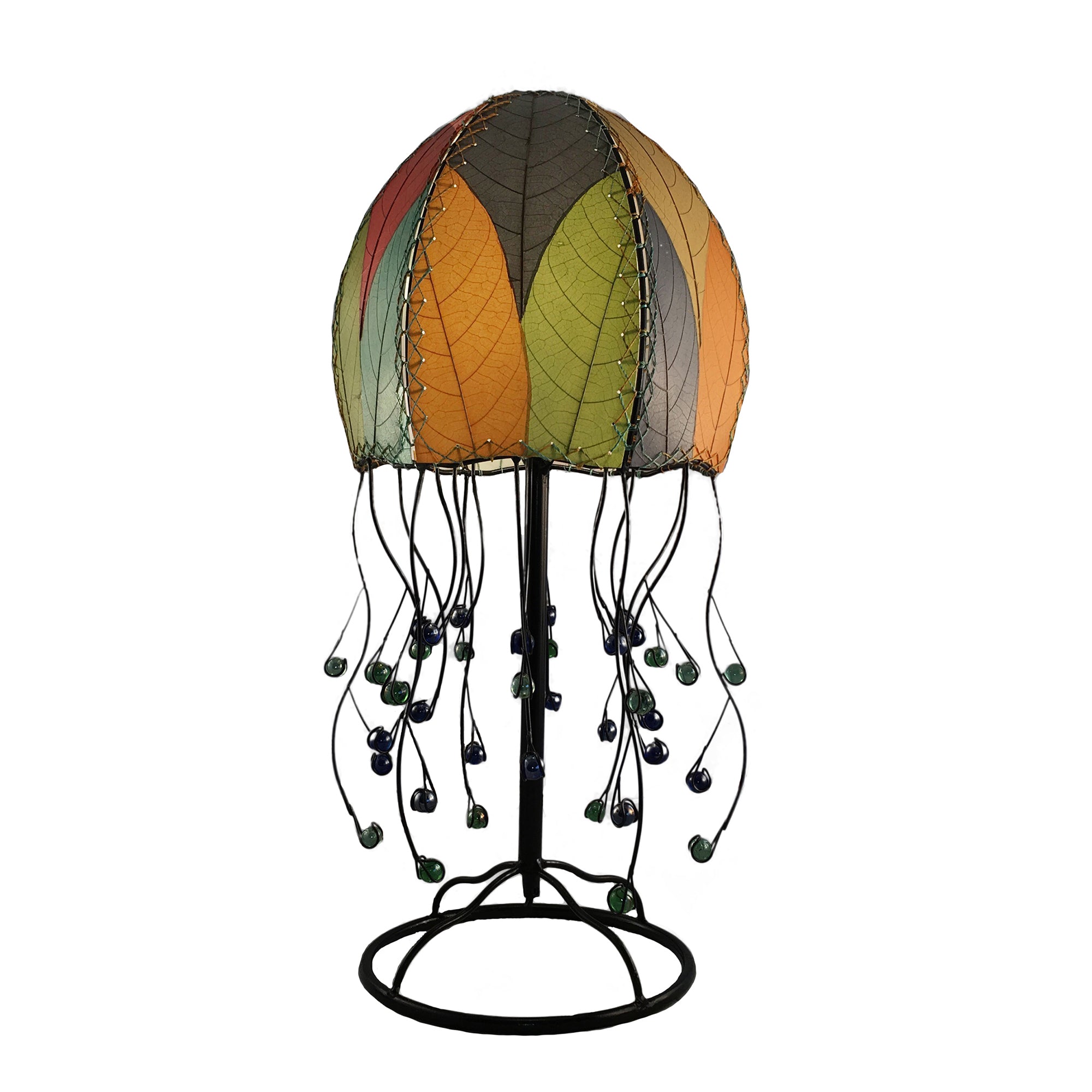 This lamp is unique and self-defined. Designed to mirror the free-swimming marine animal, the domed shade is covered in real fossilized cocoa leaves and each wrought iron tentacle grasps a single glass bead stinger.