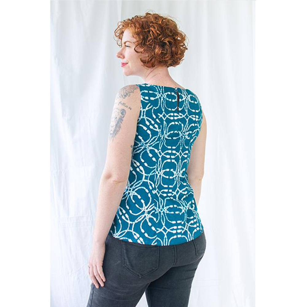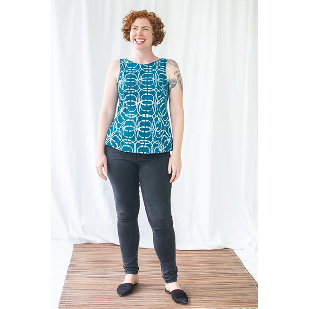 Relaxed a-line shape. Boat neck. Slit keyhole with covered-button closure at back neck. Sleeveless. Princess seams. Tunic length. 100% organic cotton.
